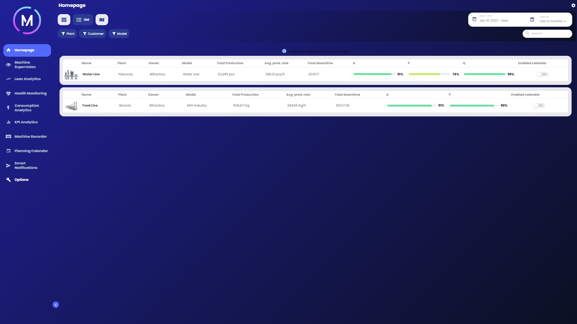 In questa visualizzazione vengono proposte tutte le macchine presenti per il progetto corrente sotto forma di lista. Ad ogni riga corrisponde un asset e per ognuno vengono indicate informazioni utili relative al possessore e ai KPI di produzione.