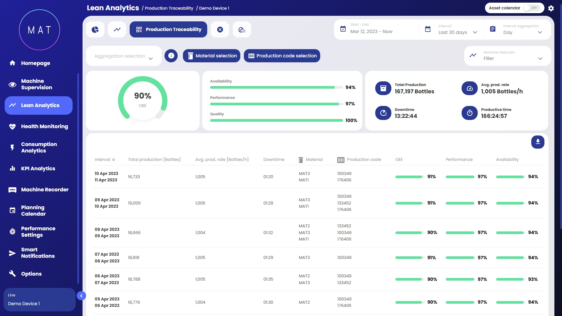 selezionando un determinato fattore di aggregazione, è possibile suddividere ulteriormente la produzione in funzione del fattore selezionato, ad esempio: turni, lotti, materiale utilizzato ecc. Per esempio, se si seleziona il periodo temporale “settimana” e il fattore di aggregazione “materiale” ci saranno tante righe per ogni settimana quante le tipologie di materiali che sono state utilizzati durante la stessa;