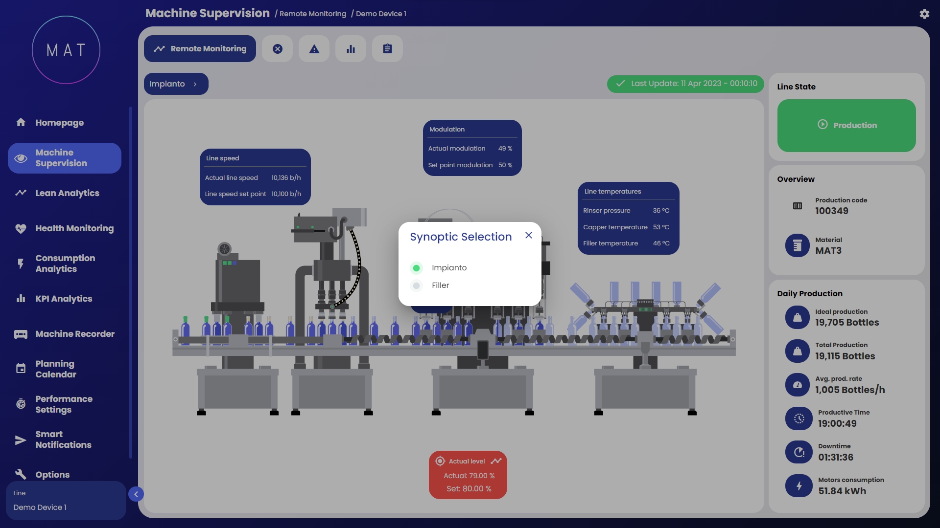 Quando previsto, è possibile selezionare la sezione della macchina/linea della quale si vogliono visualizzare i dati tramite apposito menu a tendina dal nome “Impianto” o “Impianto generale” posizionato in alto a sinistra del render 3D.